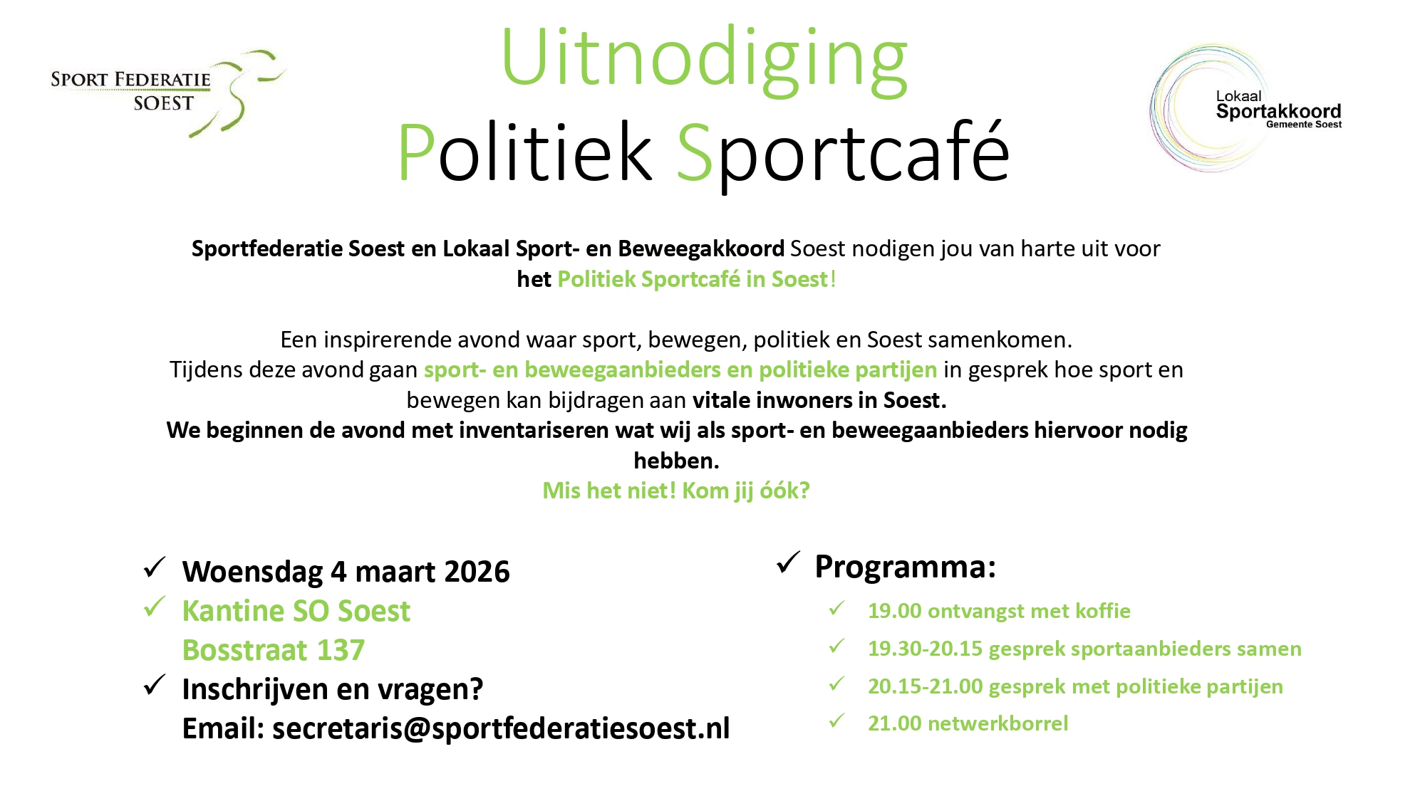 Inschrijven en vragen? E-mail secretaris@sportfederatiesoest.nl